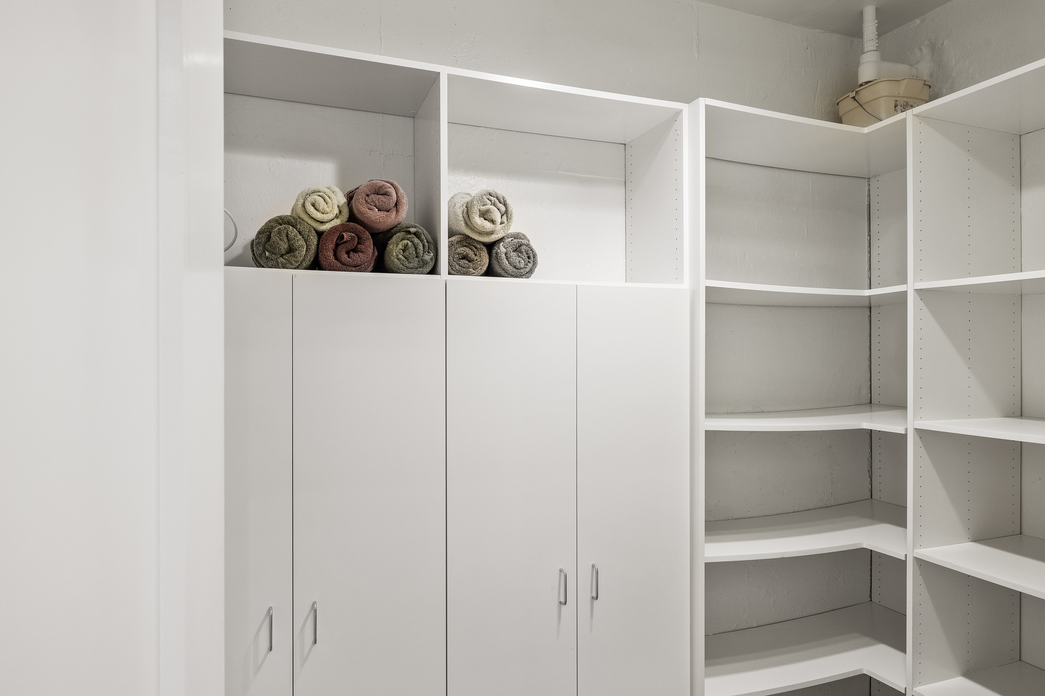 The lower level includes two generous bedrooms, access to a private terrace, a laundry room, and a large walk-in pantry/storage area.